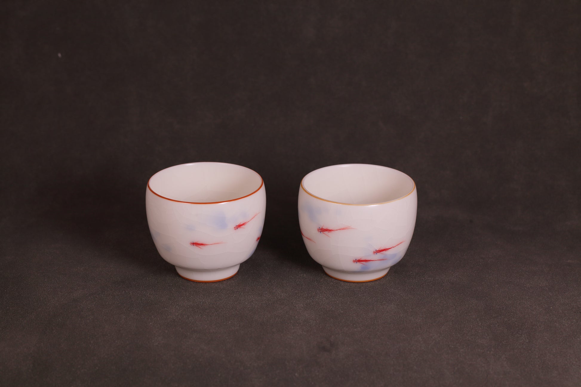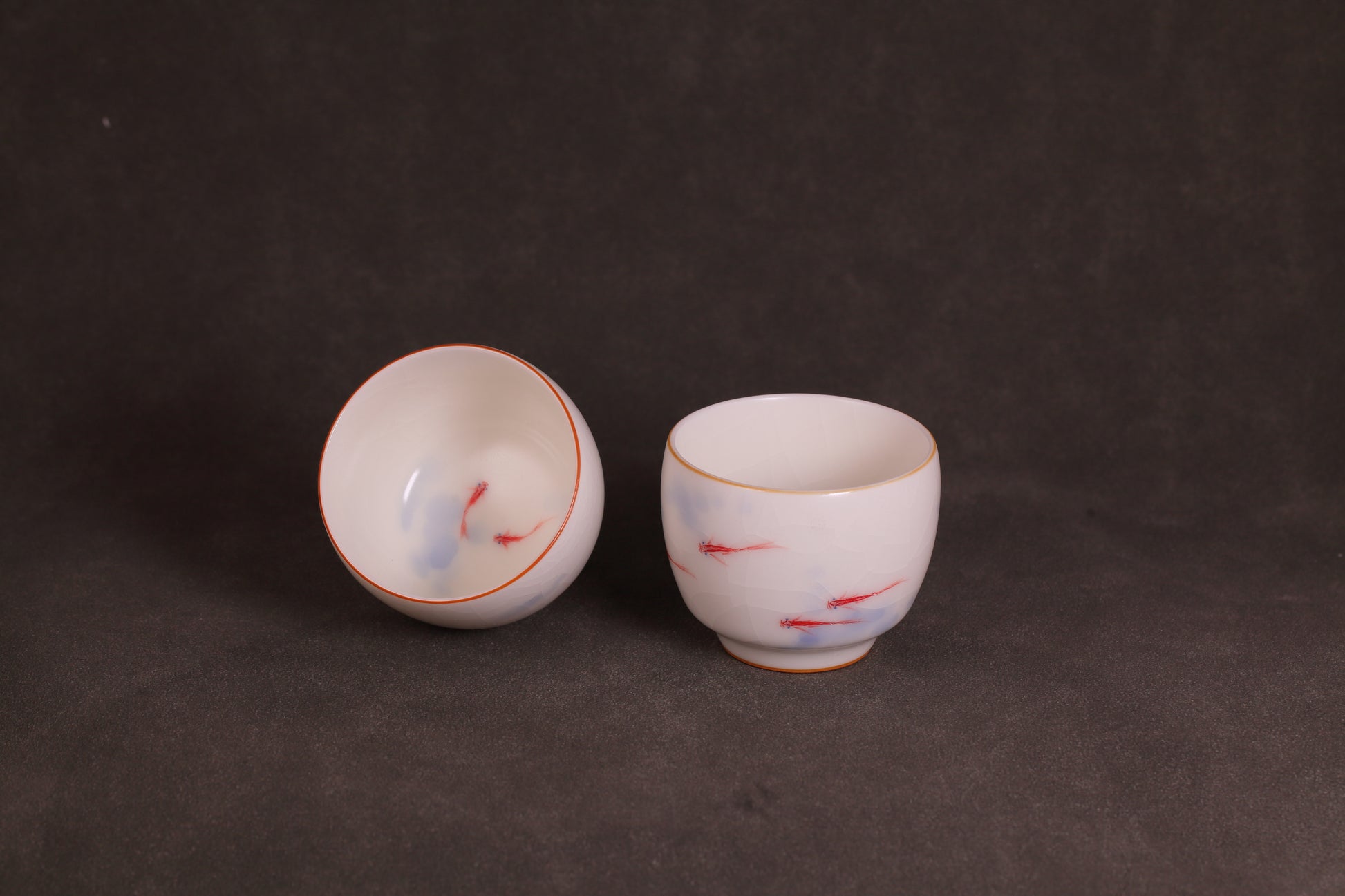 这套汝窑茶具,以温润如玉的白釉为底,玛瑙入釉,匠人以青花与釉下红料挥洒点染,描绘出灵动的小金鱼。寥寥数笔,却生机盎然,仿佛清泉中自在游弋。