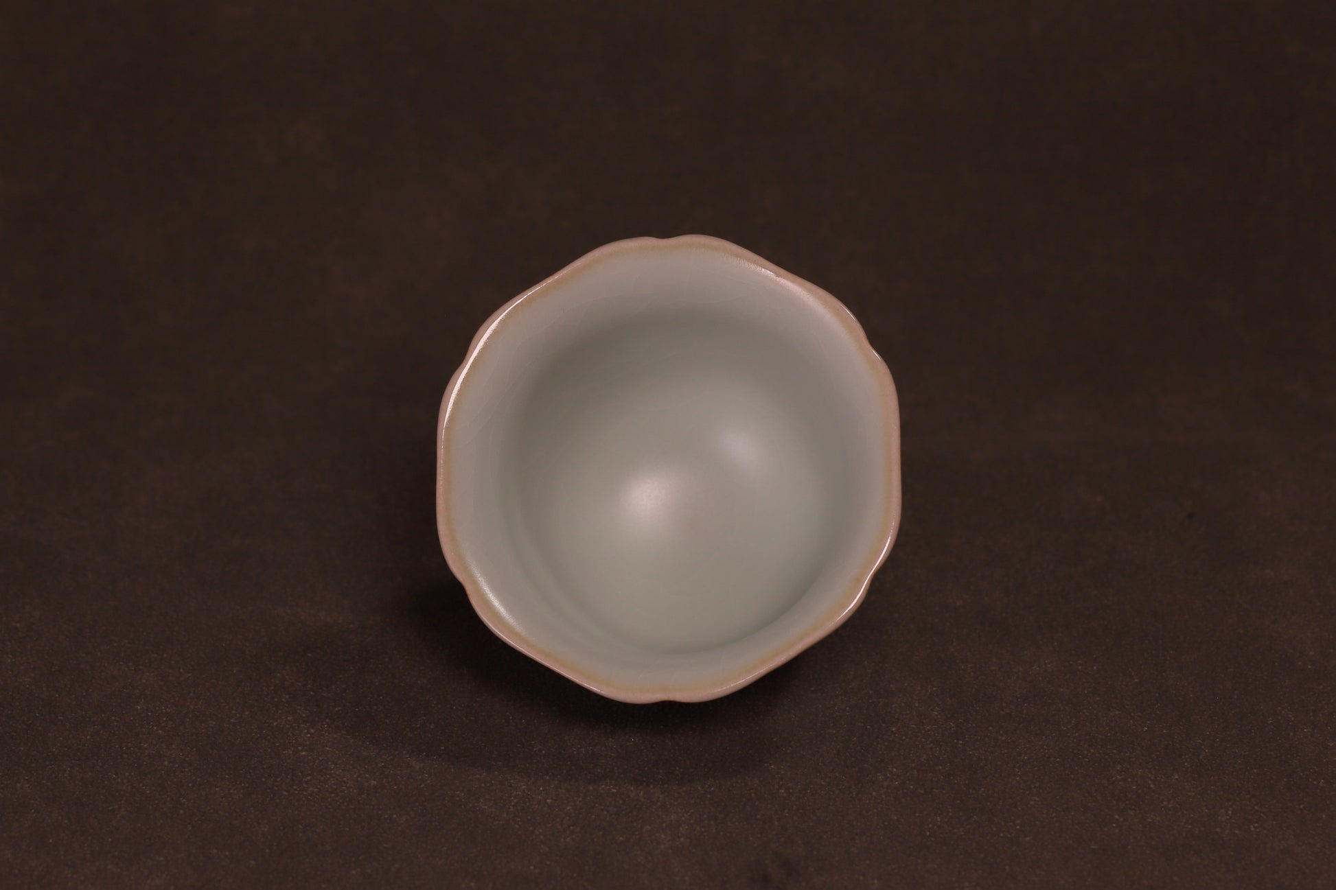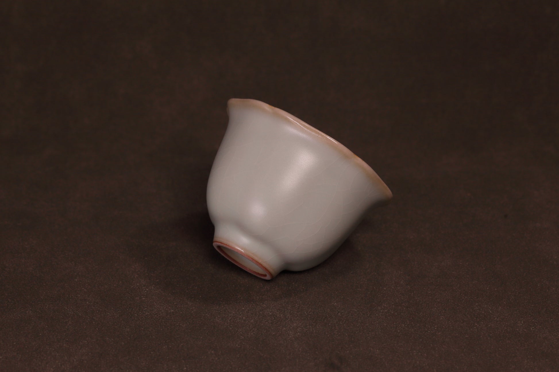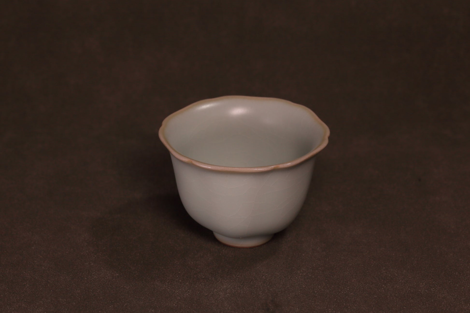 天青釉色如雨后初晴,温润含蓄,釉面细碎开片隐于光下。杯口呈六至八瓣微波之形,线条不刻意、不对称,却自然协调。杯沿一圈浅铁锈色,犹如细描之笔,为整器勾勒清晰轮廓。